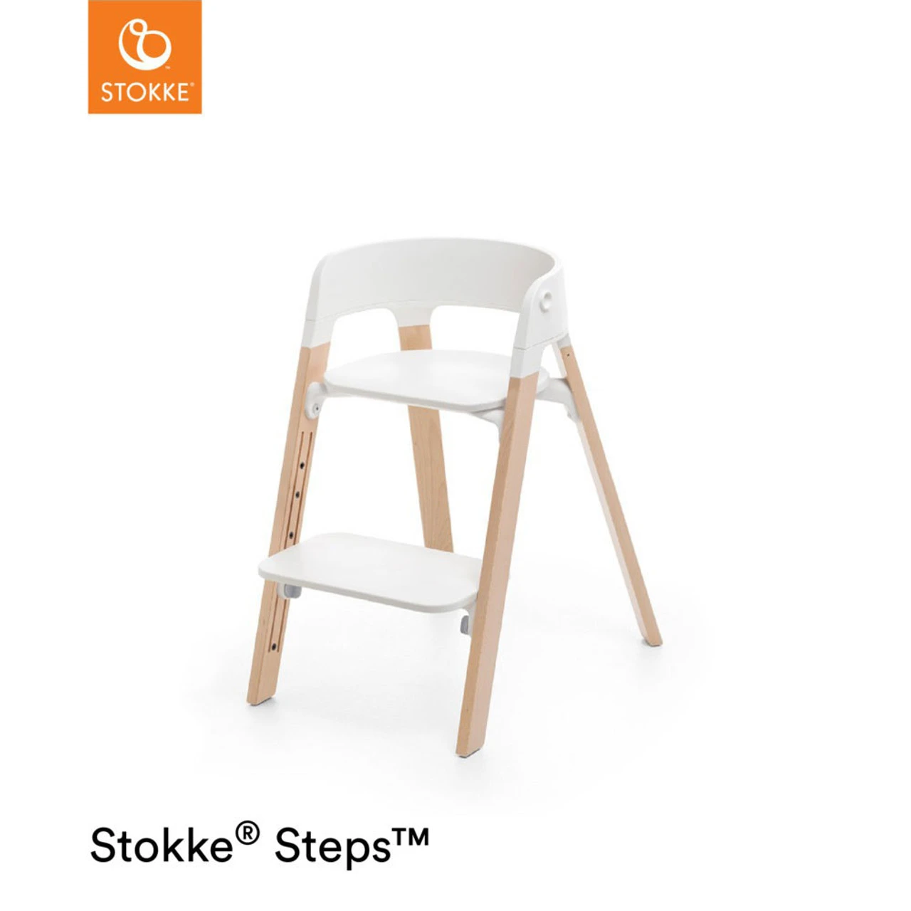 Stokke® Steps™ Chair can be used with additional accessories to create a complete 5-in-1 seating system. From birth up to approx. 6 months it cat be used with specially designed Stokke® Steps™ Bouncer or Newborn Set attached on the top. After that you can use it as a proper feeding highchair with Baby Set (included), optional Tray and Cushion, which can be detached over time. The Steps™ Chair on its own is intended to use from 3 years old up to 84kg 187lbs of maximum user weight!