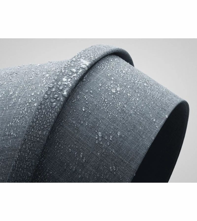 Soft blue fibers, woven together with lighter, neutral fibers give a rich melange look to the water repellent textiles used exclusively for this stroller. |