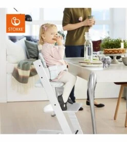 The Tripp Trapp? Chair is conveniently offered in a package that also provides a Tripp Trapp? Baby Set with harness and gliders, plus a Tripp Trapp? Classic Cushion and Tray. When used together, these items make a standalone high chair, which safely and ergonomically sits children from 6 months to 3 years. The adjustable design allows freedom of movement with both depth and height adjustable seat and footplates, ensuring ergonomic seating positions throughout its use. Remove/replace the accessories at a later life stage to continue to use the Tripp Trapp? Chair as your child grows beyond this High Chair stage (3 yrs. old). By removing and/or using without the tray, this High Chair fits right up to your dining table, bringing your baby into the heart of your family to learn and develop alongside you.